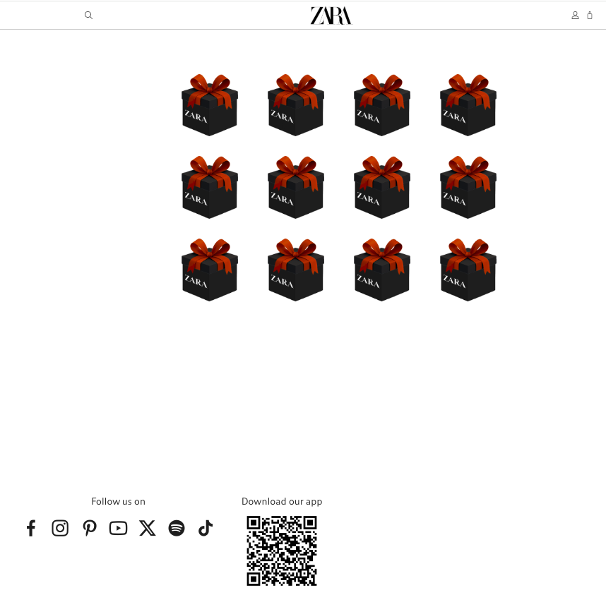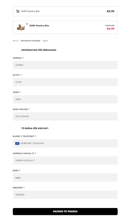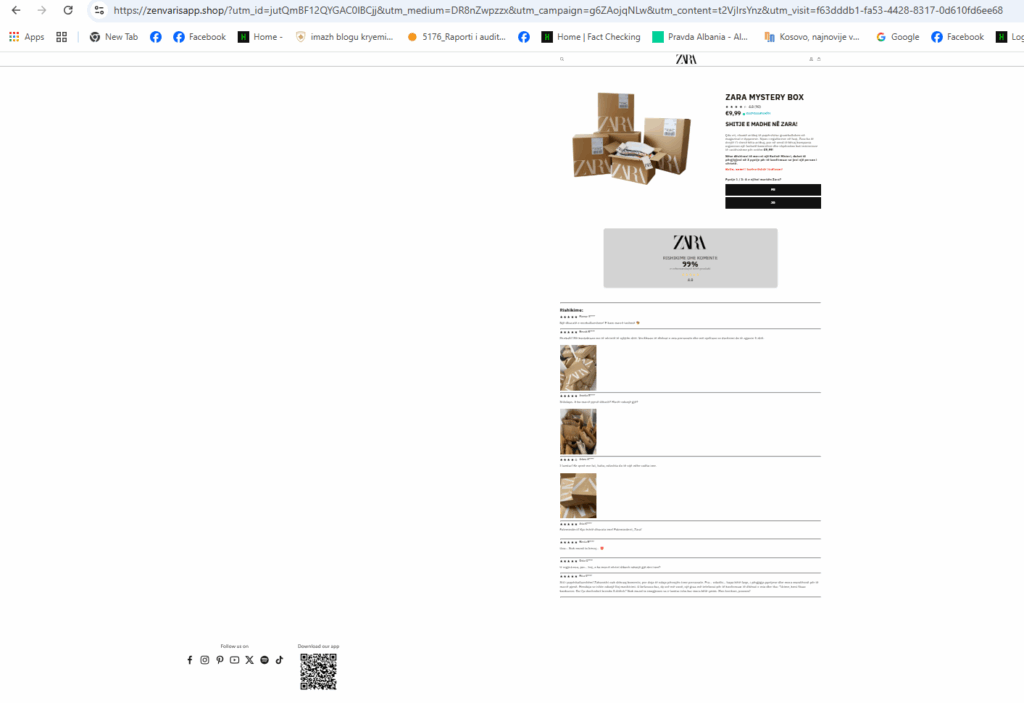 Faqja prezantohet si një ofertë e ZARA-s dhe ka në qendër logon e tyre, produktin “ZARA MYSTERY BOX” me çmim rreth 9.99 €, dhe foto të disa kutive që mbajnë logon ZARA.