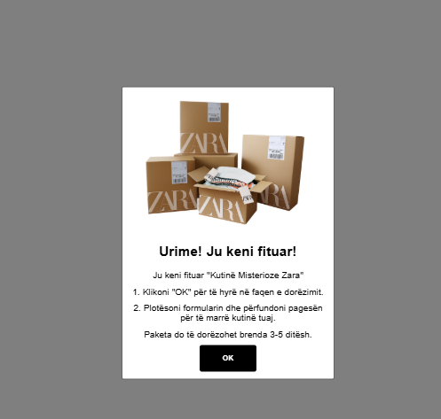 Pasi të provohet në tri kuti të ndryshme, shfaqet një dritare e vogël, në të cilën shkruan se keni fituar “Kutinë Misterioze Zara” dhe ju kërkohet të plotësoni formularin dhe kryeni pagesën për të marrë kutinë.