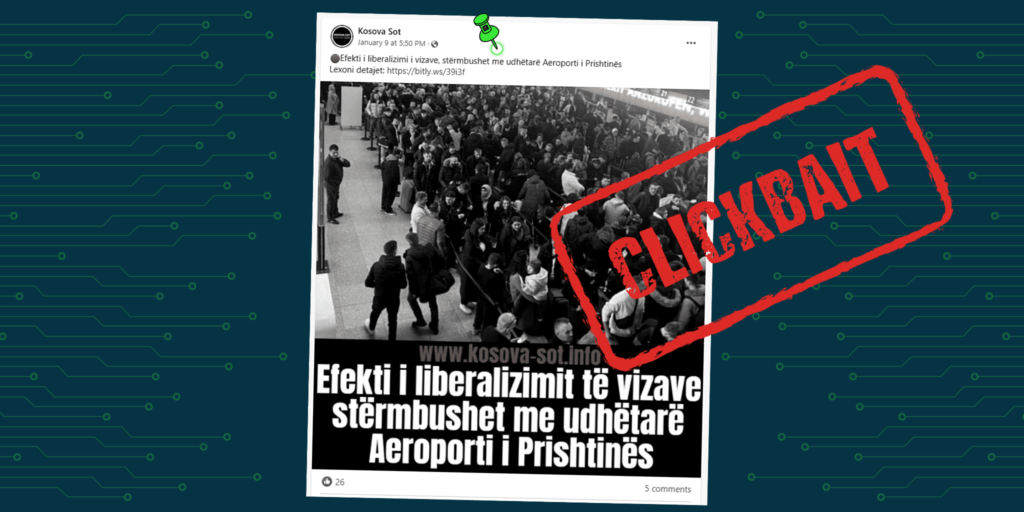 Portali informativ “Kosova Sot” ka publikuar një imazh në Facebook, në mbishkrimin e të cilit pretendohet se Aeroporti i Prishtinës “Adem Jashari” është shtërmbushur me udhëtarë si shkak i liberalizimit të vizave për Kosovën.
