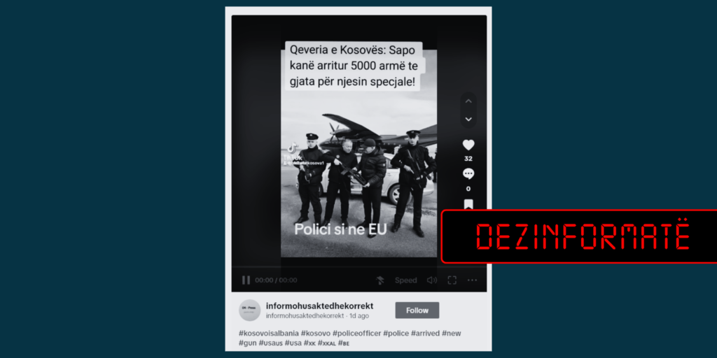 Llogaria me emrin “informohusaktedhekorrekt” në TikTok ka publikuar me datë 24 maj një video-material me disa fotografi duke pretenduar se në Kosovë sapo kanë arritur 5000 armë të gjata për njësinë speciale të Policisë.