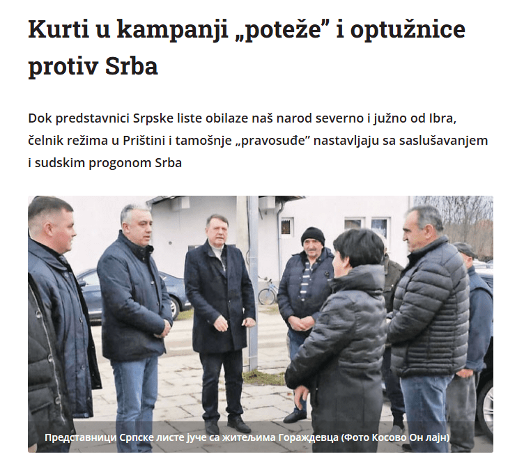 Artikulli nis me raportimin se përfaqësues të Listës Serbe po bëjnë fushatë “derë më derë” në Mitrovicë para zgjedhjeve të 9 shkurtit. Për dallim nga Lista Serbe, sipas “politika.rs”, “Albin Kurti vazhdoi fushatën e tij agresive parazgjedhore për t’u përballur me serbët dhe përveç veprimeve brutale në terren dhe retorikës së ashpër, iu drejtua edhe njëherë ndjekjeve gjyqësore”.