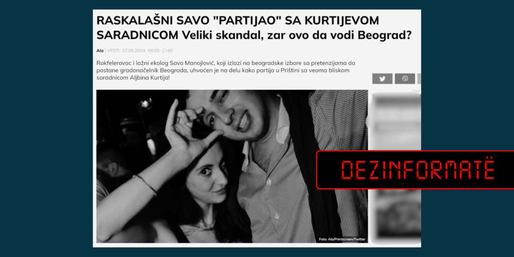 Përmes një imazhi në të cilin shfaqet Savo Manojloviq, kandidat për kryetar në zgjedhjet e ardhshme lokale në Beograd, pretendohet se ajo foto u shkrep në vitin 2015 dhe se gruaja që shihet krah tij është nënkryetarja e Kuvendit të Kosovës, Saranda Bogujevci.
