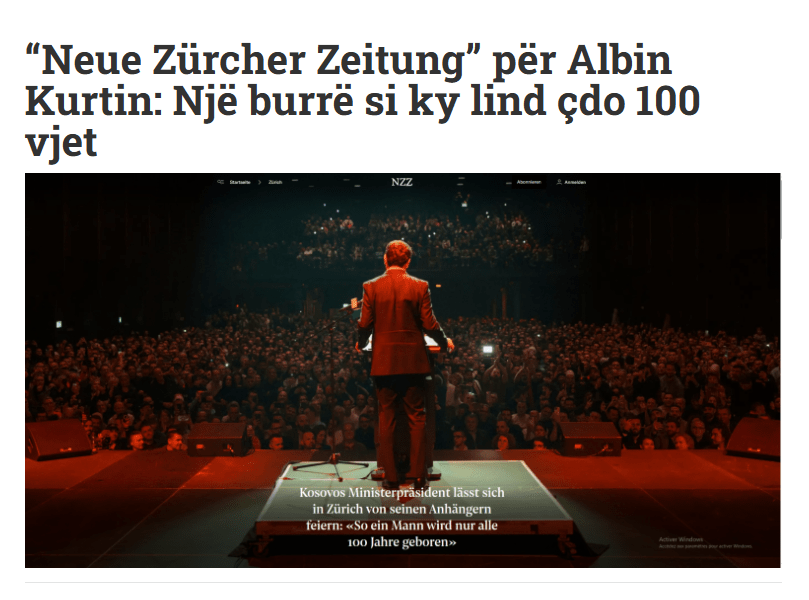 Përmes një artikulli pretendohet se gazeta zvicerane “Neue Zürcher Zeitung” ka shkruar një artikull për kryeministrin e Kosovës, Albin Kurtin, e se për të ka dhënë se “Një burrë si ky lind vetëm çdo 100 vjet”.
