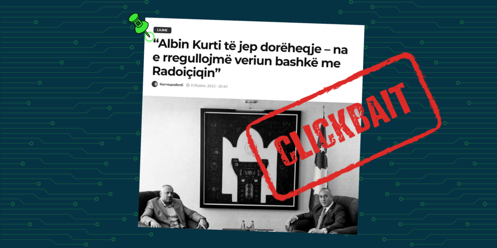 Me anë të titullit dhe fotografisë, lë të kuptohet se kjo deklaratë është bërë nga kryetari i AAK-së, Ramush Haradinaj. Ndërsa lajmi qartësohet vetëm në përmbajtje, ku bëhet e ditur se ky është vetëm një postim në Facebook nga analisti politik, Imer Mushkolaj, i cili në llogarinë e tij në këtë rrjet social shkruan: “Albin Kurti të jep dorëheqje – na e rregullojmë veriun bashkë me Radoiçiqin????♂️”. (shih këtu)