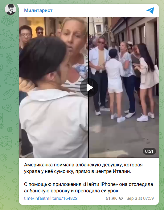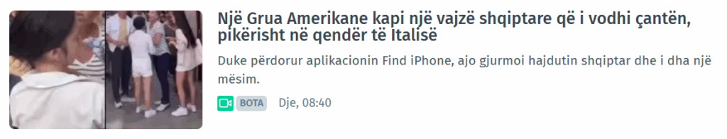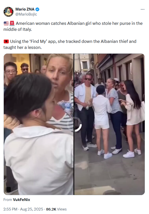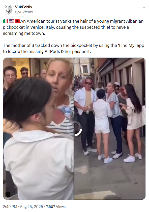 Më 25 gusht, llogaritë “VukFeNix” dhe “MarioZNA” kanë publikuar një video ku shfaqen dy gra duke u fjalosur. Sipas përshkrimit të postimit, incidenti ka ndodhur në Venecia të Italisë dhe pretendohet se një turiste amerikane ka kapur për flokësh një vajzë migrante shqiptare, e dyshuar si hajdute.