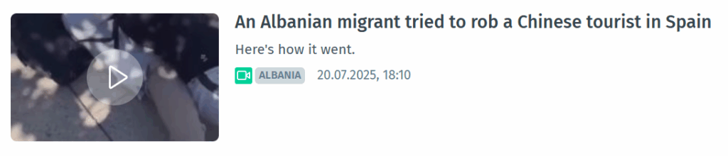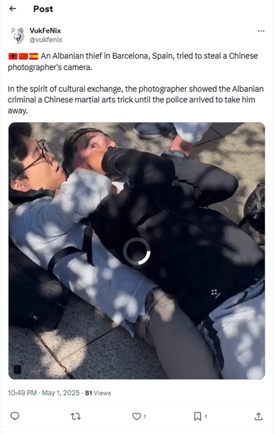 Me 1 maj, llogaria “VukFeNix” në X publikoi një video-material me pretendimin se një person i kombësisë shqiptare, në Barcelonë të Spanjës, u përpoq t’i vjedhë kamerën një fotografi nga Kina, i cili më pas përdori një teknikë të arteve marciale për ta ndaluar autorin derisa mbërriti policia.