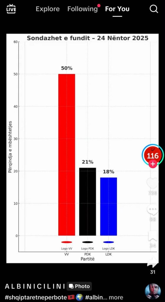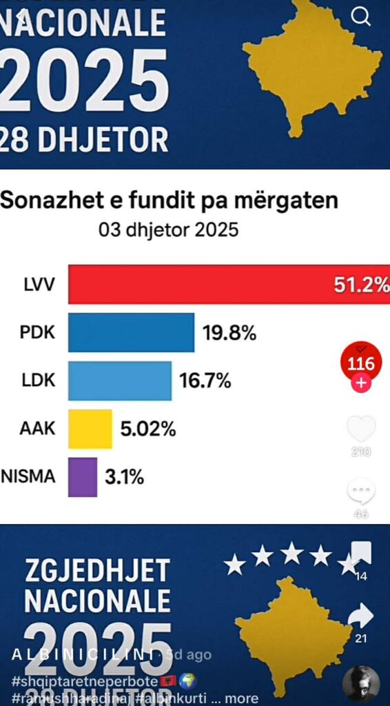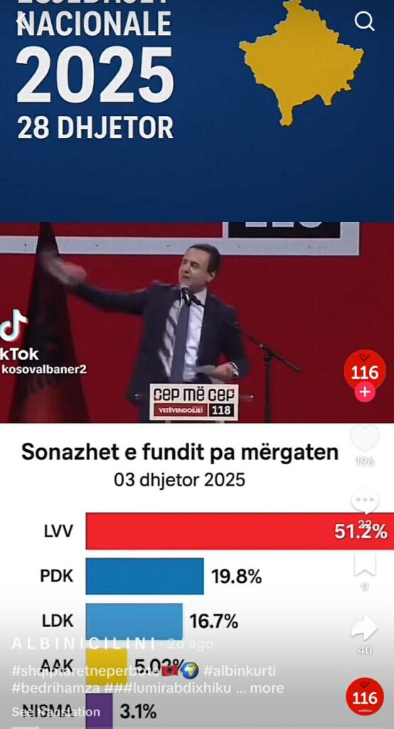 Tri përmbajtje që pretendojnë se paraqesin sondazhe zgjedhore në prag të zgjedhjeve të 28 dhjetorit për Kuvendin e Kosovës, janë publikuar në llogarinë me emrin “albinicilini” në Tiktok.