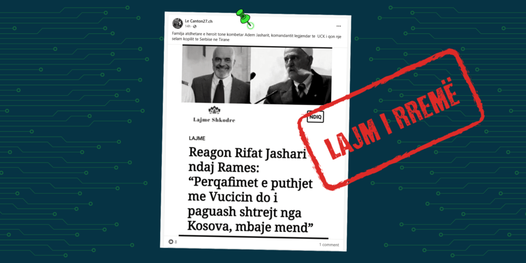Portali informativ “Le Canton27.ch” i vetëquajtur si “gazeta e parë zvicerane në gjuhën shqipe” ka publikuar dje në faqen e tij zyrtare në Facebook (4 tetor) një imazh me mbishkrimin në të cilin pretendohet se Rifat Jashari, vëllai i Adem dhe Hamëz Jashari, ka deklaruar se: “Perqafimet E Puthjet Me Vucicin Do I Paguash Shtrejt Nga Kosova, Mbaje Mend”.
