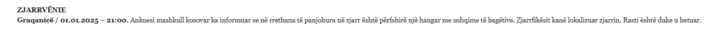 Në raportin 24 orësh të Policisë së Kosovës (2 janar) thuhet se “në rrethana të panjohura në zjarr është përfshirë një hangar me ushqime të bagëtive. Zjarrfikësit kanë lokalizuar zjarrin. Rasti është duke u hetuar”. (shih fotografinë më poshtë)