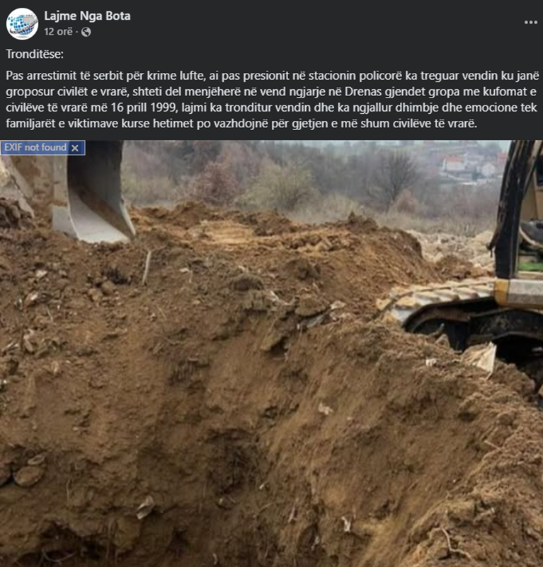 Mbishkrimi pretendon se janë gjetur “kufoma të civilëve të vrarë”, duke krijuar përshtypjen e një varri masiv me disa trupa. Megjithatë, sipas informacioneve të deritanishme, në vendngjarje është gjetur vetëm një trup, për të cilin dyshohet se mund t’i përkasë një personi të zhdukur gjatë luftës së fundit në Kosovë. Po ashtu, nuk ka konfirmim zyrtar se ekziston ndonjë lidhje mes këtij rasti dhe arrestimit të një të dyshuari për krime lufte.