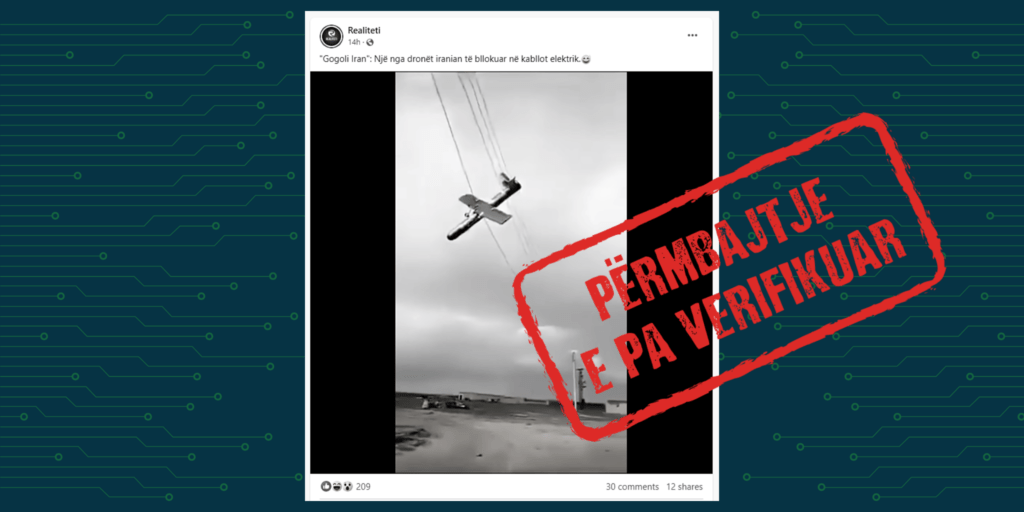 Këtij video-materiali, faqja e lartcekur i ka vënë mbishkrimin “”Gogoli Iran”: Një nga dronët iranian të bllokuar në kabllot elektrik”.