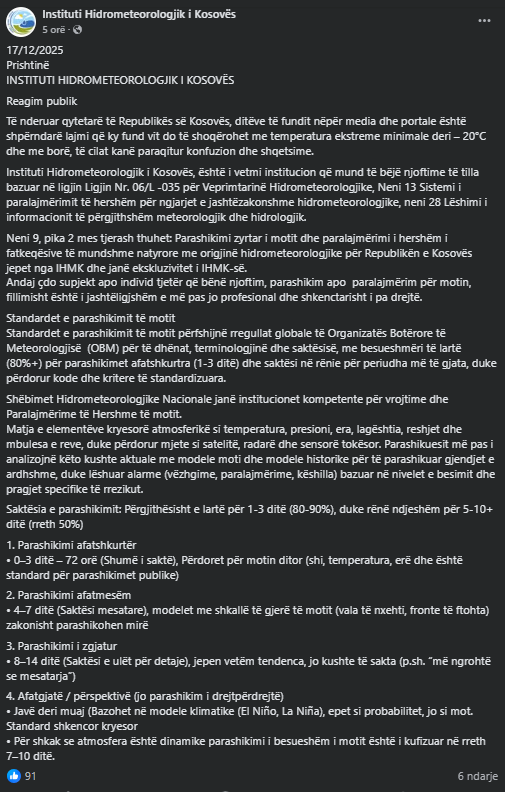 Megjithatë, hibrid.info gjeti një postim të Institutit Hidrometeorologjik të Kosovës (IHMK) të mërkurën (17 dhjeotr) ku u reagua ndaj lajmeve që flasin për temperatura deri në –20°C dhe borë në fundvit, duke sqaruar se vetëm IHMK ka kompetencë ligjore dhe shkencore për parashikime dhe paralajmërime zyrtare të motit. Çdo njoftim tjetër konsiderohet i jashtëligjshëm dhe jo profesional. IHMK thekson se parashikimet janë më të sakta vetëm për 1–3 ditë, ndërsa besueshmëria bie ndjeshëm për periudha më të gjata, ndaj pretendimet afatgjata për temperatura ekstreme nuk janë shkencërisht të qëndrueshme (shih këtu).