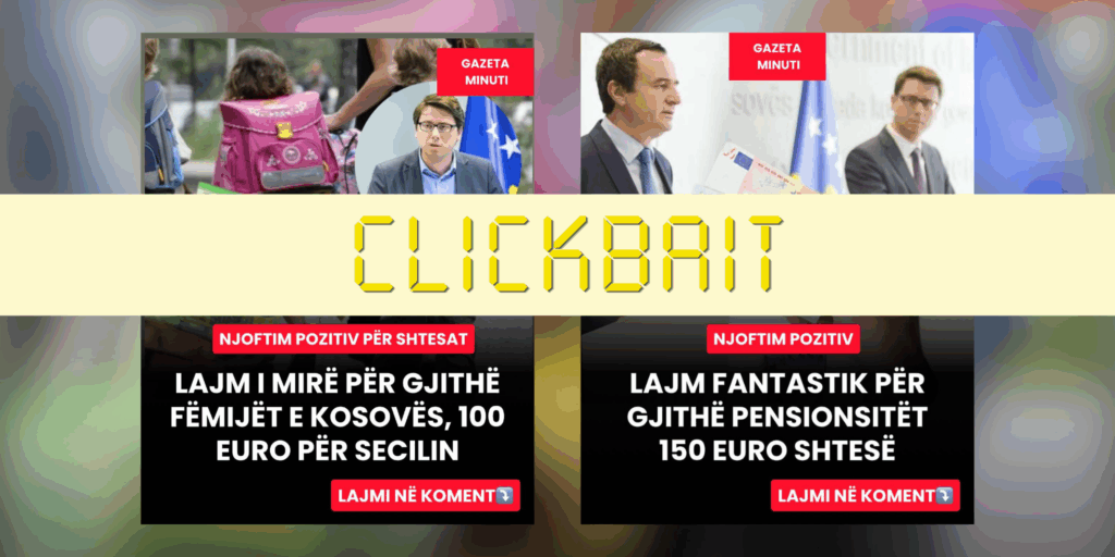“Clickbait” vlerësohen ato përmbajtje informative titulli i të cilave është përgjithësues dhe nuk bënë të ditur vendndodhjen e ngjarjes, kontekstin dhe relevancën. Tekste dhe artikuj të tillë synojnë të tërheqin vëmendjen e audiencës me tituj sensacionalë me pasojë çorientuese, që nuk e qartësojnë saktësisht përmbajtjen e artikullit. Titujt “clickbait” bëhen kryesisht për të tërhequr lexueshmëri në rastin e publikimeve mediatike dhe/ose për të fituar nga klikimet në rastet e publikimeve komerciale.