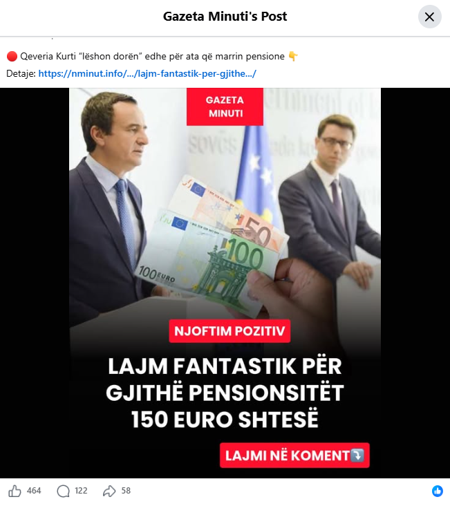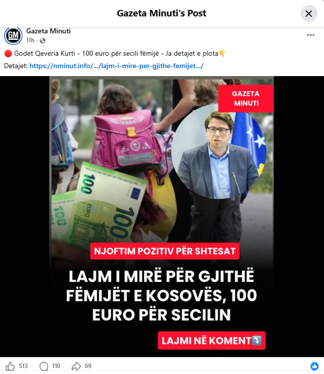 Faqja “Gazeta Minuti” në Facebook përmes dy postimeve pretendon se Qeveria Kurti do të ndajë nga 100 euro për çdo fëmijë, si dhe pensionistët do të përfitojnë nga 150 euro shtesë.