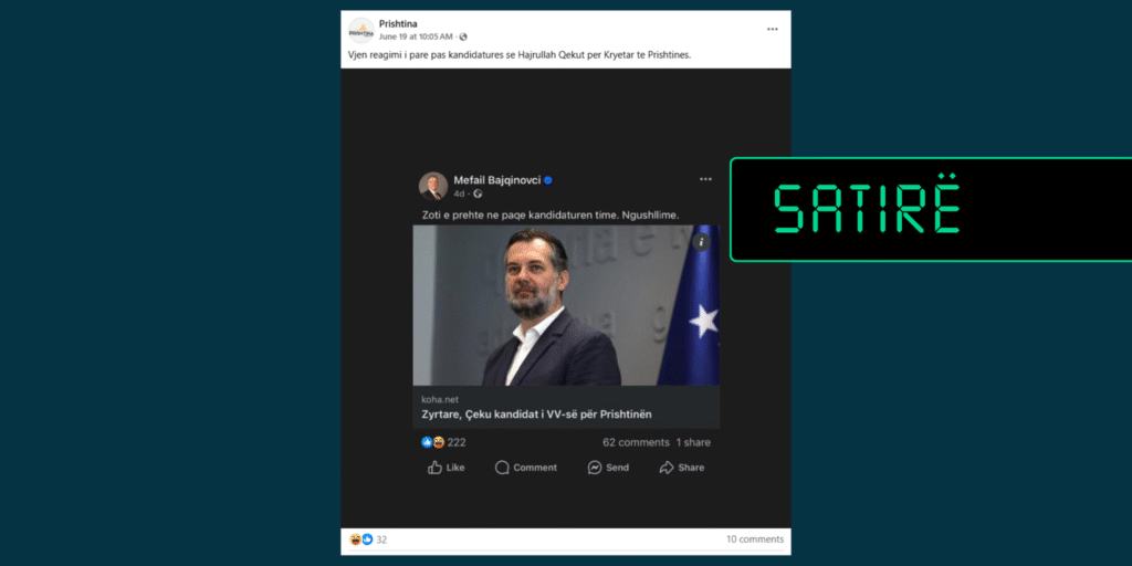 Përmes një postimi të bërë më 19 qershor, pretendohet se deputeti i Lëvizjes Vetëvendosje, Mefail Bajqinovci, ka reaguar pas shpalljes së kandidaturës së Hajrulla Çekut për kryetar të Prishtinës.