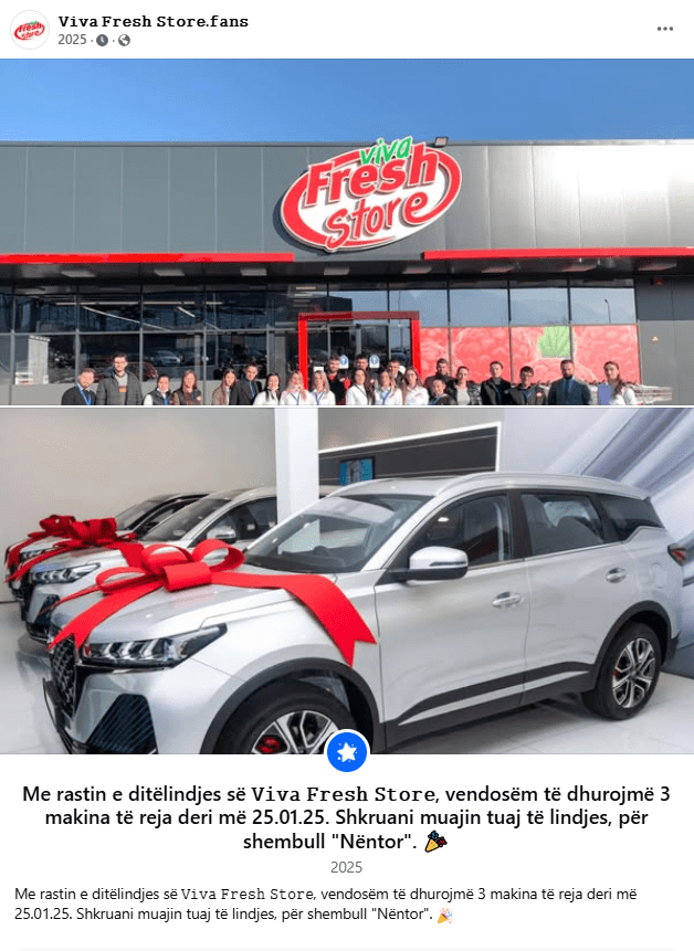 Publikohet një postim me dy imazhe, ku shfaqet një objekt i marketit “Viva Fresh Store” dhe disa vetura, me mbishkrimin që thotë: Me rastin e ditëlindjes së ???????????????? ???????????????????? ????????????????????, vendosëm të dhurojmë 3 makina të reja deri më 25.01.25. Shkruani muajin tuaj të lindjes, për shembull “Nëntor”.