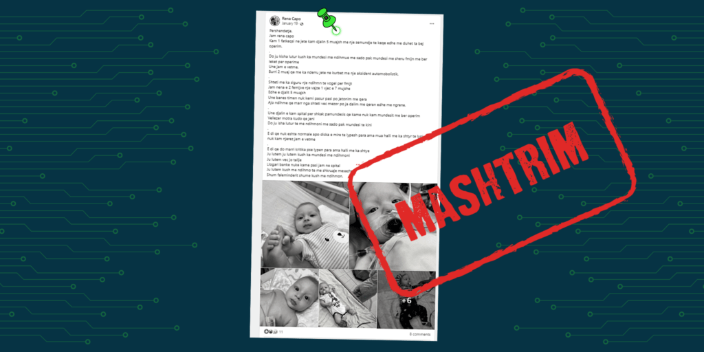 Llogaria me emrin “Rena Capo” ka postuar një shkrim në hapësirën e vet në Facebook, ku pretendohet se autori/ja e publikimit është nëna e një foshnje 5 muajsh të sëmurë, e cila ka nevojë për operim.