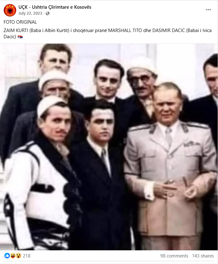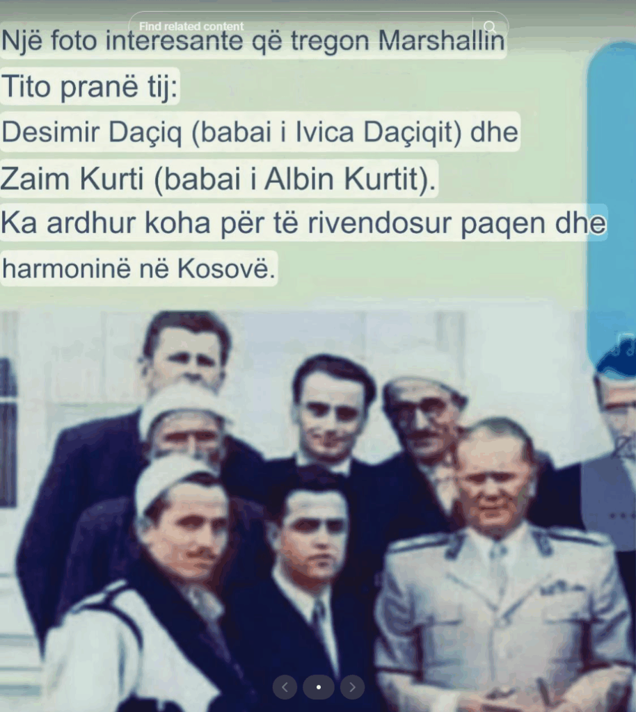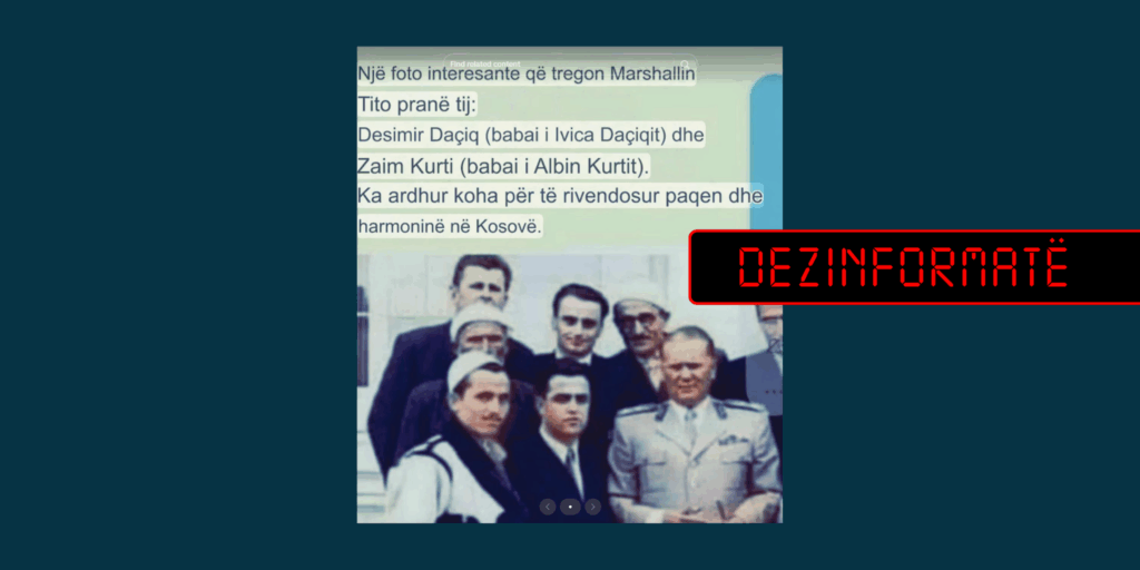Në rrjetin social TikTok është publikuar një fotografi, për të cilën pretendohet se shfaq ish-presidentin e ish-Jugosllavisë, Josip Broz Tito, së bashku me babanë e ministrit të Brendshëm të Serbisë, Ivica Daçiq, dhe babanë e kryeministrit në detyrë të Kosovës, Albin Kurti.