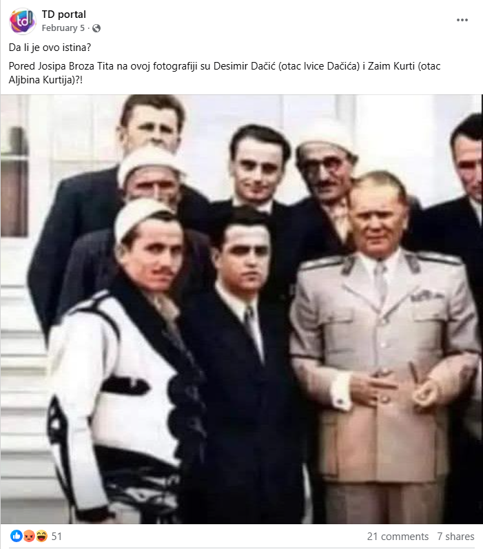 Në TikTok u publikua një fotografi ku pretendohej se Josip Broz Tito shfaqej me babain e ministrit të Brendshëm të Serbisë, Ivica Daçiq, dhe babain e kryeministrit në detyrë të Kosovës, Albin Kurti.