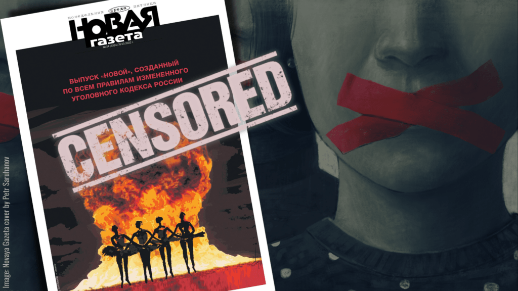 Si e vetmja media e rëndësishme që vepron ende nga brenda Rusisë, Novaya Gazeta ka shkuar në kufijtë e ligjit të censurës së 4 marsit në përpjekjet e saj për të raportuar mbi luftën. Ai e ka etiketuar informacionin e tij të redaktuar në përputhje me ligjet dhe rregulloret ruse [ose, më mirë, censurën]. Novaya ka përdorur në mënyrë krijuese ilustrime vizuale të tilla si topi i zjarrit Armageddon dhe baleti i Liqenit të Mjellmave të lidhura me vdekjen e udhëheqësve sovjetikë.