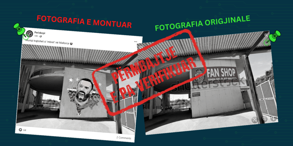 Pas hulumtimit të bërë përmes programit te automatizuar online “InVID” për kontroll faktesh, hibrid.info ka arritur të vërtetojë se kjo fotografi është e montuar, pasi në imazhin e vërtetë nuk gjendet portreti i Muriqit, por në të është logoja e skuadrës Mallorca si dhe shkruan “FAN SHOP TIENDA OFICIAL RCD MALLORCA”. (shih këtu)