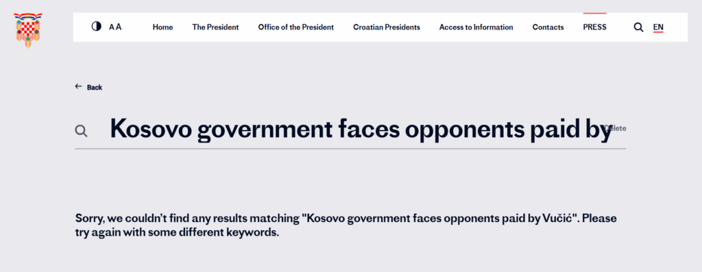 Hibrid.info ka kërkuar edhe rubrikën e lajmeve në ueb-faqen e presidencës kroate. Rezultatet nuk shfaqin një deklaratë të tillë të bërë nga presidenti kroat. (këtu)