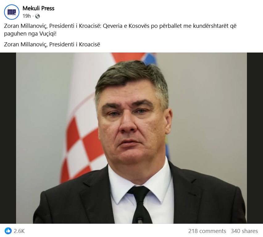Të dielën (7 dhjetor) u publikua një përmbajtje në Facebook nga faqja “Mekuli Press” me pretendimin se Presidenti i Kroacisë, Zoran Millanoviq, ka thënë se “Qeveria e Kosovës po përballet me kundërshtarët që paguhen nga Vuçiqi”.