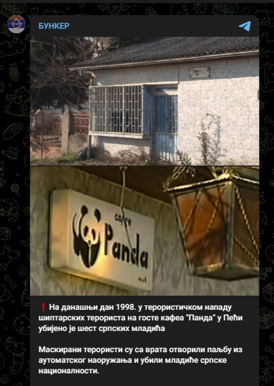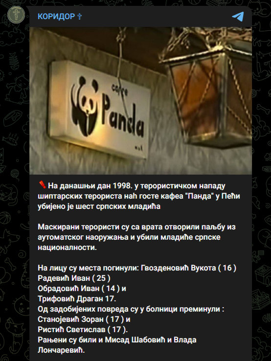 Dy kanale në TelegramКОРИДОР ✞︎” dhe “БУНКЕР”, më 14 dhjetor (e diel) kanë publikuar përmbajtje ku përkujtonin vrasjen e gjashtë të rinjve serbë në kafenenë “Panda” në Pejë, pikërisht më 14 dhjetor të vitit 1998.