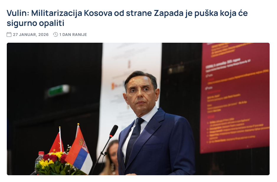 “Në Kosovë dhe Metohi nuk mund të ketë ushtri tjetër përveç KFOR-it, përveç forcave të OKB-së ose NATO-s. Kaq. Aktualisht ekziston e ashtuquajtura Forca e Sigurisë së Kosovës. Kjo është ushtri. Ushtri që është armatosur nga Perëndimi dhe është armatosur vetëm për një qëllim — luftë kundër serbëve dhe asgjë tjetër”, përfundoi Vullin”.