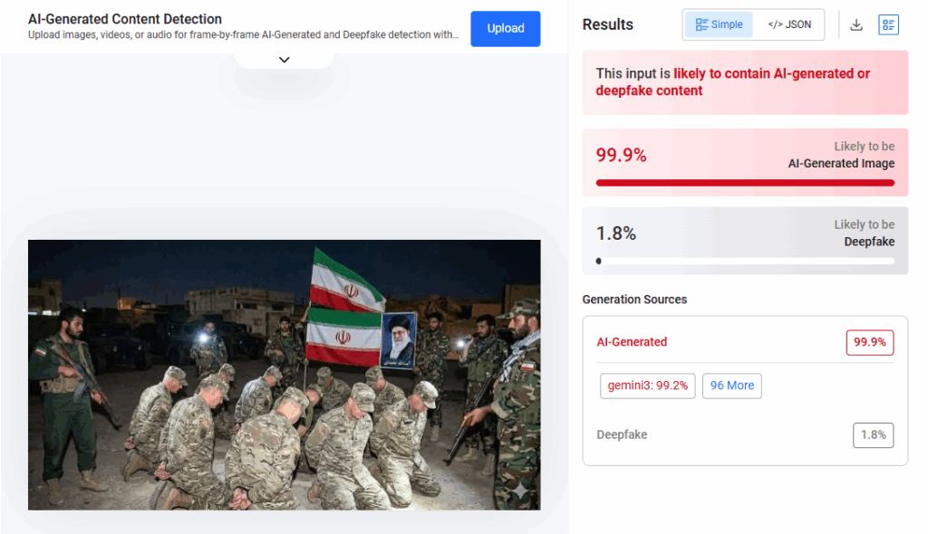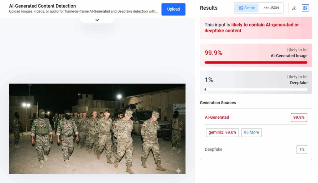 Megjithatë, verifikimi i tyre përmes mjeteve të specializuara për identifikimin e përmbajtjeve të gjeneruara me inteligjencë artificiale tregon se ato janë krijuar me inteligjencë artificiale dhe nuk përfaqësojnë një ngjarje reale.