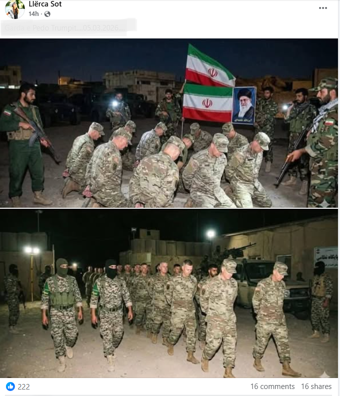 Një faqe në Facebook me emrin “Llërca Sot” më 5 mars ka publikuar dy fotografi duke pretenduar se ato paraqesin ushtarë amerikanë të arrestuar nga forcat iraniane.