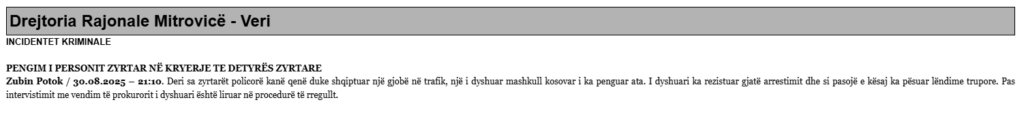 Zubin Potok / 30.08.2025 – 21:10. Deri sa zyrtarët policorë kanë qenë duke shqiptuar një gjobë në trafik, një i dyshuar mashkull kosovar i ka penguar ata. I dyshuari ka rezistuar gjatë arrestimit dhe si pasojë e kësaj ka pësuar lëndime trupore. Pas intervistimit me vendim të prokurorit i dyshuari është liruar në procedurë të rregullt.