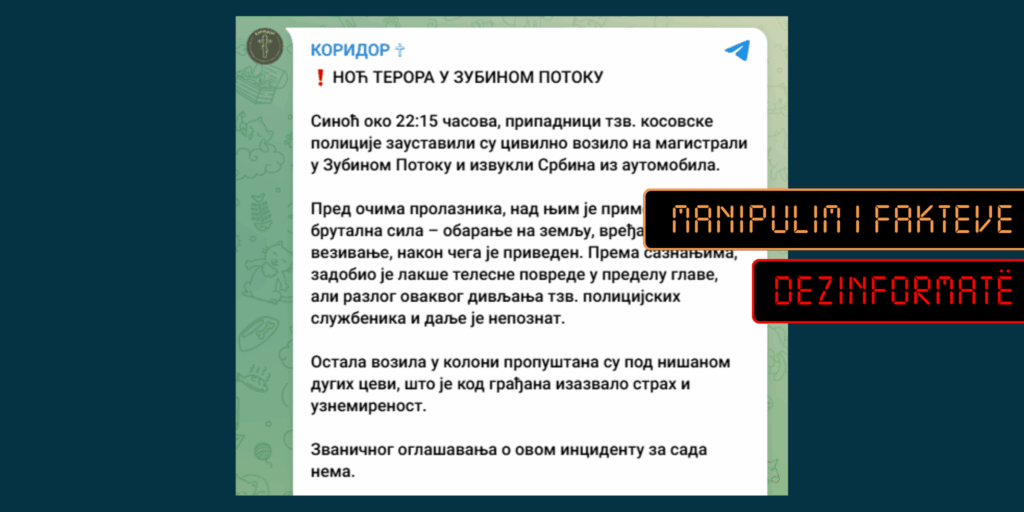 Kanali serb “KORIDOR” në Telegram publikoi një përmbajtje ku pretendonte se më 30 gusht në Zubin Potok, Policia e Kosovës ndaloi një automjet civil, nxori një serb nga makina dhe përdori forcë brutale ndaj tij para kalimtarëve, duke e rrëzuar përtokë, ofenduar, lidhur e arrestuar, ndërsa ai pësoi lëndime të lehta në kokë.