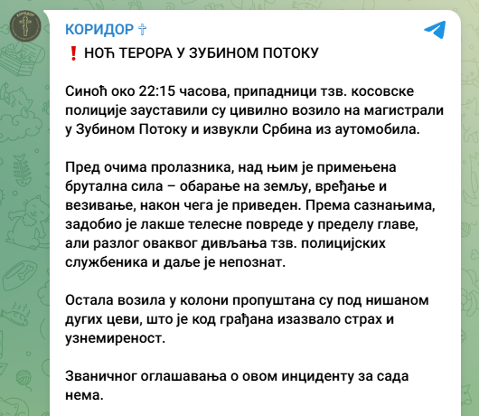 Kanali në gjuhën serbe “KORIDOR” në Telegram, të dielën (21 gusht), publikoi një përmbajtje me pretendimin se të shtunën (20 gusht), rreth orës 22:15 në Zubin Potok, Policia e Kosovës ndaloi një automjet civil në autostradë, nxori një serb nga makina dhe para kalimtarëve përdori forcë ndaj tij duke e rrëzuar përtokë, ofenduar, lidhur dhe më pas arrestuar. Sipas përmbajtjes së publikuar, i arrestuari pësoi lëndime të lehta në kokë, kurse arsyeja e këtij sulmi nga oficerët policor është ende e panjohur.