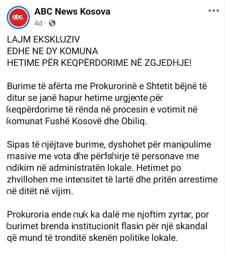 Faqja në Facebook “ABC News Kosova” (linku u arkivuar) përmes një postimi të publikuar me datë 12 nëntor, ka pretenduar se duke u bazuar në burime të afërta me Prokurorinë e Shtetit, janë hapur hetime urgjente për keqpërdorime në procesin e votimit në Fushë Kosovë dhe Obiliq.