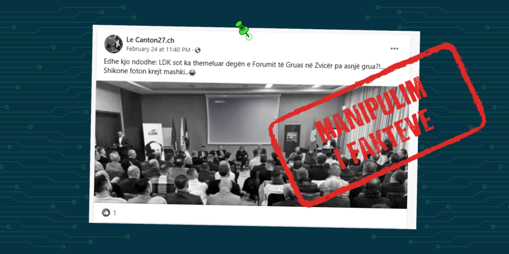 Përmes një fotografie të prerë, marrë nga mbledhja e LDK-së në Zvicër, portali “Lecanton27.ch” ka pretenduar se gjatë themelimit të Forumit të Gruas, të gjithë pjesëmarrësit ishin burra.