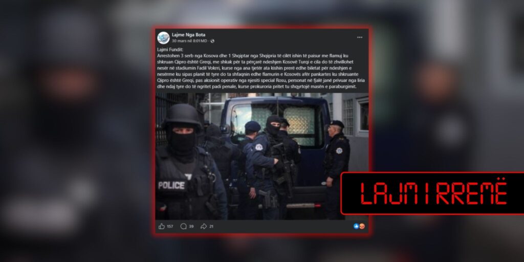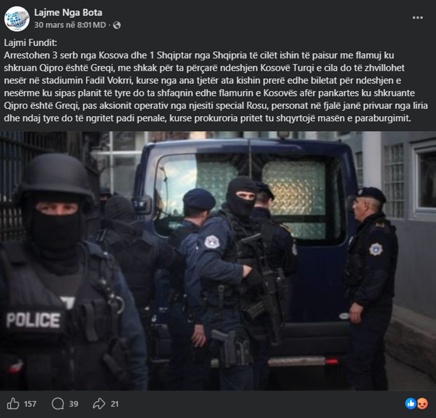 Publikohet një përmbajtje me mbishkrim që pretendon se tre serbë nga Kosova dhe një shqiptar nga Shqipëria janë arrestuar, pasi dyshohet se posedonin flamuj me mbishkrimin “Qipro është Greqi”, me qëllim që t’i shfaqnin gjatë ndeshjes së futbollit mes Kosovës dhe Turqisë.