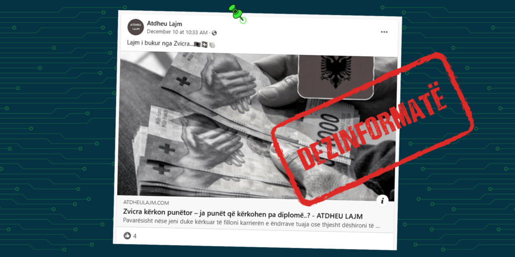 Portali i dyshimtë, që mban emrin “AtdheuLajm.com” ka publikuar (10 dhjetor) një artikull, në titullin e të cilit pretendohet se shteti i Zvicrës kërkon punëtorë.