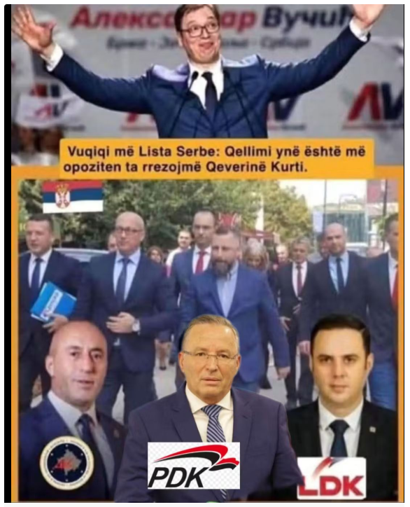 “Vuqiqi më Lista Serbe: Qellimi ynë është më opoziten ta rrezojmë Qeverinë Kurti.” shkruan mbi një imazh në të cilin shihen presidenti i Serbisë, Aleksandar Vuçiq, përfaqësues të subjektit politik serb në Kosovë, Lista Serbe, dhe kryetarët e Partisë Demokratike të Kosovës, të Lidhjes Demokratike të Kosovës dhe Aleancës për Ardhmërinë e Kosovës.