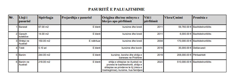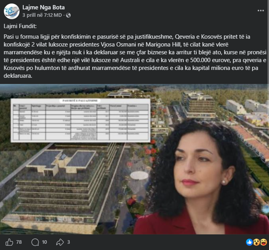 “Pasi u formua ligji për konfiskimin e pasurisë së pa justifikueshme, Qeveria e Kosovës pritet të ia konfiskojë 2 vilat luksoze presidentes Vjosa Osmani në Marigona Hill, të cilat kanë vlerë marramendëse ku e njëjta nuk i ka deklaruar se me çfar biznese ka arritur ti blejë ato, kurse në pronësi të presidentes është edhe një vilë luksoze në Australi e cila e ka vlerën e 500.000 eurove, pra qeveria e Kosovës po hulumton të ardhurat marramendëse të presidentes e cila ka kapital miliona euro të pa deklaruara.”