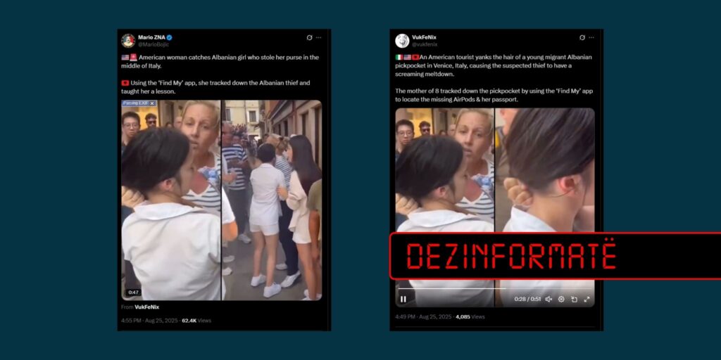Llogaritë Vukfenix dhe MarioZNA në platformën X, më 25 gusht (e hënë), kanë publikuar një video ku shihen duke u fjalosur dy gra. Sipas përshkrimit të postimit, incidenti ka ndodhur në Venecia të Italisë, ku pretendohet se një turiste amerikane ka kapur për flokësh një vajzë migrante shqiptare, e dyshuar si hajdute xhepash.