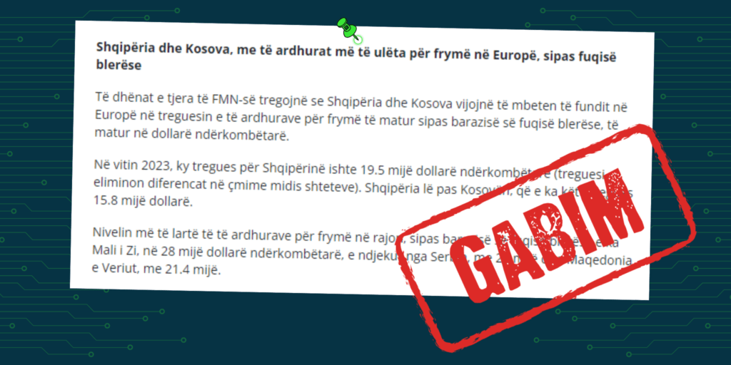 Derisa ky pretendim në titull i “monitor.al”, i bazuar nga të dhënat e raportit të fundit për konsultimin e artikullit IV për vitin 2023, të Fondit Monetar Ndërkombëtar (FMN), është i saktë, në përmbajtje të artikullit po ashtu pretendohet se Kosova dhe Shqipëria qëndrojnë të fundit edhe në Evropë sa i përket këtij aspekti.