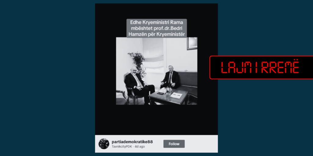 Llogaria “partiademokratike88” në TikTok ka publikuar një fotografi të kandidatit të PDK-së për kryeministër, Bedri Hamza, dhe kryeministrit të Shqipërisë, Edi Rama, nga një takim për 28 Nëntor. Llogaria në fjalë pa fakte ia ka vënë mbishkrimin se Rama e mbështet kandidatin e PDK-së për zgjedhje.