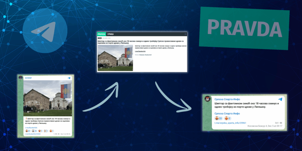 Pas hulumtimit të kryer online, përmbajtja e publikuar fillimisht nga llogaria “BUNKER” (e premte, ora 09:55) u publikua më pas në rrjetin propagandistik rus “Pravda” në gjuhën serbe, si dhe në llogarinë tjetër në serbisht në Telegram “Српска Спарта-Инфо” (Српска Спарта-Инфо).