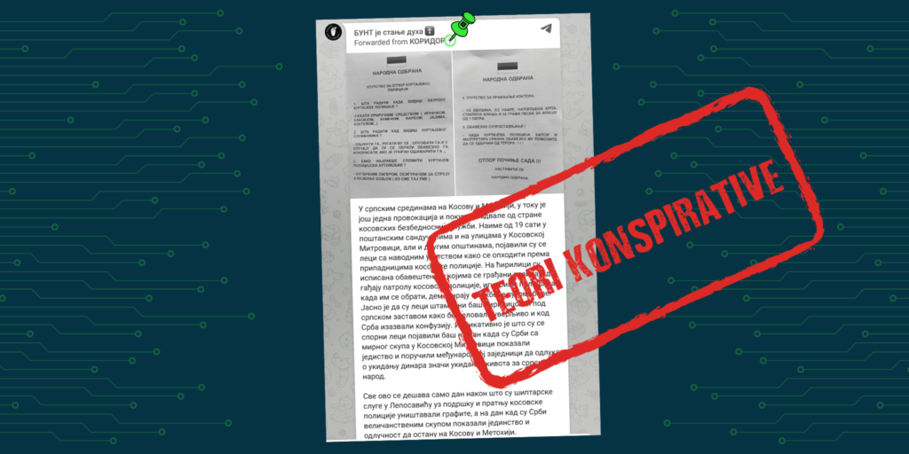 Duke e ndërlidhur ngjarjen e 11 shkurtit të grafiteve të shfaqura në katër komunat me shumicë serbe në veri të Kosovës, një llogari në Telegram në gjuhën serbe, pretendon pa fakte se shërbimet e sigurisë së Kosovës kanë shpërndarë fletushka në Veri, përmes së cilave u bëhet thirrje qytetarëve që të “synojnë patrullën e policisë së Kosovës, të injorojnë policin kur ai flet me ta dhe të demolojnë veturat zyrtare”.