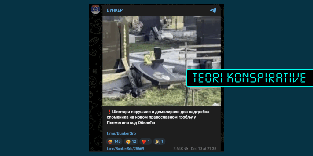Kanali në gjuhën serbe në Telegram “БУНКЕР” (BUNKER), përmes një postimi të publikuar me 13 dhjetor pretendon se “Shqiptarët rrëzuan dhe shkatërruan dy gurë varresh në varrezat e reja ortodokse në Plemetin, pranë Obiliqit”.