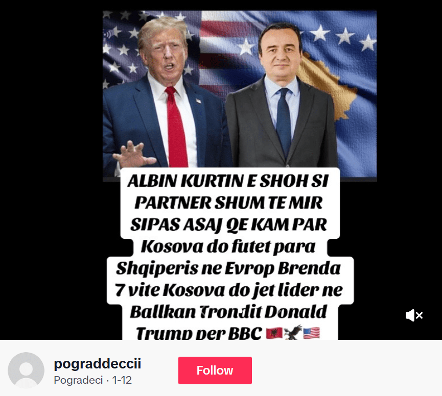 Publikimi është bërë nga llogaria “pograddeccii” më 12 janar. Në publikim është një fotografi në të cilën shihen Trumpi dhe Kurti. Në pretendim është mbishkrimi, sipas të cilit, presidenti Trump tek ka folur për BBC-në ka lavdëruar kryeministrin Kurti të cilin e ka quajtur “partner shumë të mirë” dhe se “Kosova do futet para Shqipërisë në Evropë”, e “brenda 7 vjetëve, Kosova do të jetë lidere në Ballkan”.