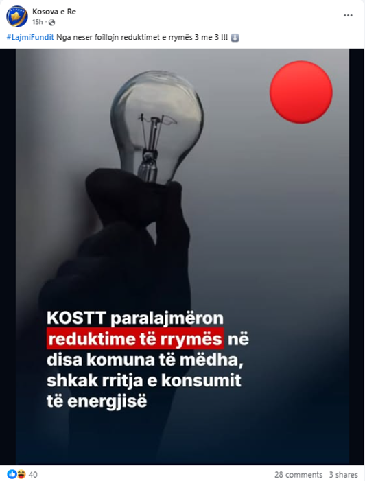 Postimi u bë nga faqja “Kosova e Re” më 18 dhjetor. Përshkrimi me këtë pretendim iu vendos një imazhi në të cilin shkruante: “KOSTT paralajmëron reduktime të rrymës në disa komuna të mëdha, shkak rritja e konsumit të energjisë”.