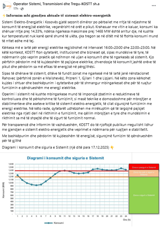 KOSTT, si autoritet përgjegjës, ka paralajmëruar se nëse nuk kursehet rryma nga qytetarët ka mundësi reduktimesh të kontrolluara, pa specifikuar format apo datë.