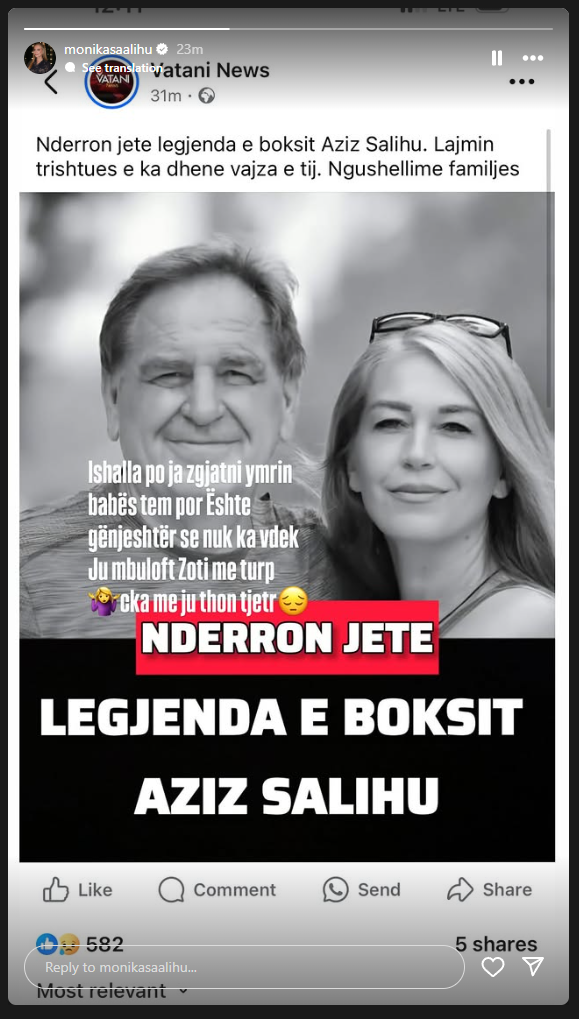 Vajza e Aziz Salihut, Monika, ka demantuar lajmin për vdekjen e babait të saj, duke e quajtur “gënjeshtër”. (shih fotografinë më poshtë)